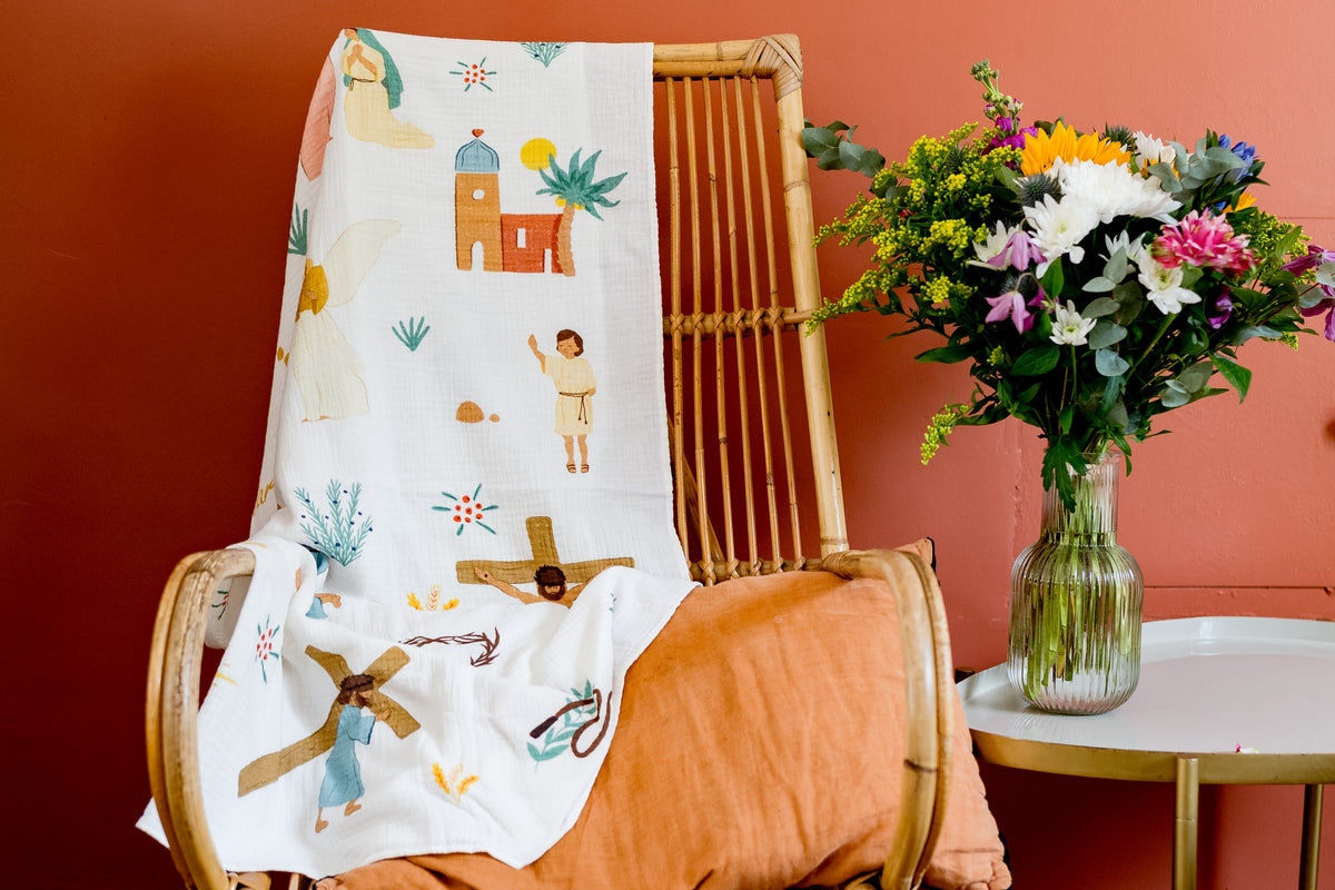 Ici, on aime. Le Bon Dieu, les fleurs, les mots consolants et les couleurs. Avec une légère passion pour les foulards porteurs de sens, les sweats et tee-shirts qui soufflent l’espérance, les langes doux comme une caresse, les motifs qui racontent une histoire, et les cartes qui proclament la Bonne Nouvelle.