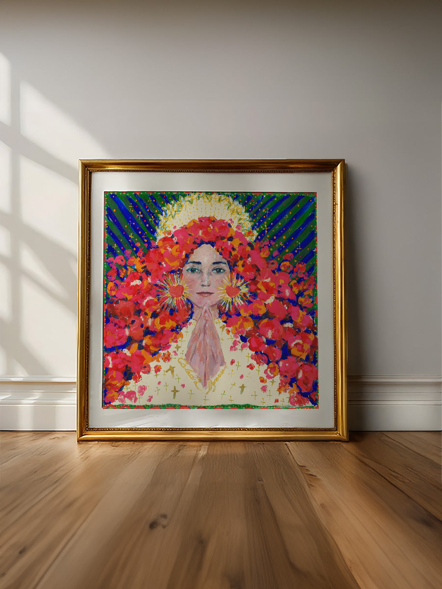 Edition limitée - Prolongez l’émotion de la collaboration Louise Groux X Caladia avec une affiche d’art numérisée de l’œuvre Fille de Sion. Une pièce à accrocher chez soi comme une icône contemporaine, célébrant la Sainte Vierge et le féminin à travers des couleurs vibrantes et une symbolique profonde.