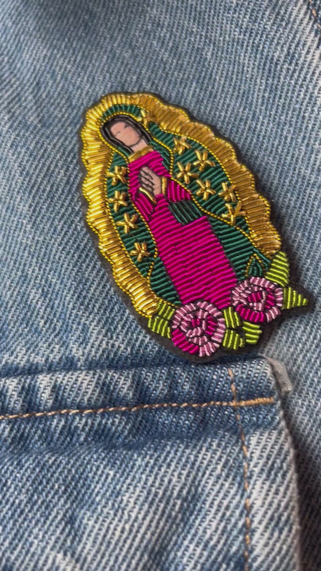 Découvrez notre nouvelle broche Notre Dame de Guadalupe, entièrement brodée à la main selon la technique ancestrale de la cannetille.