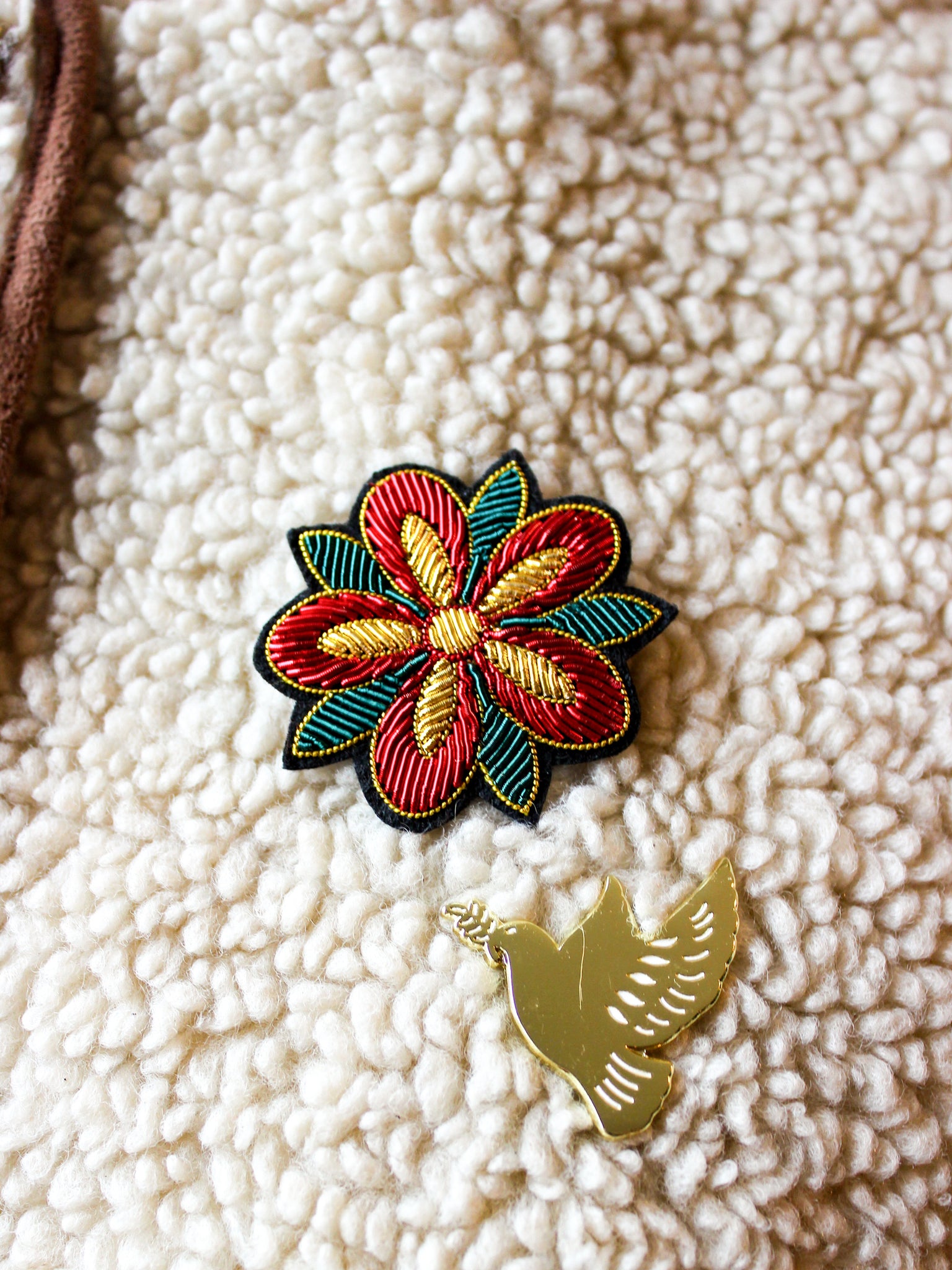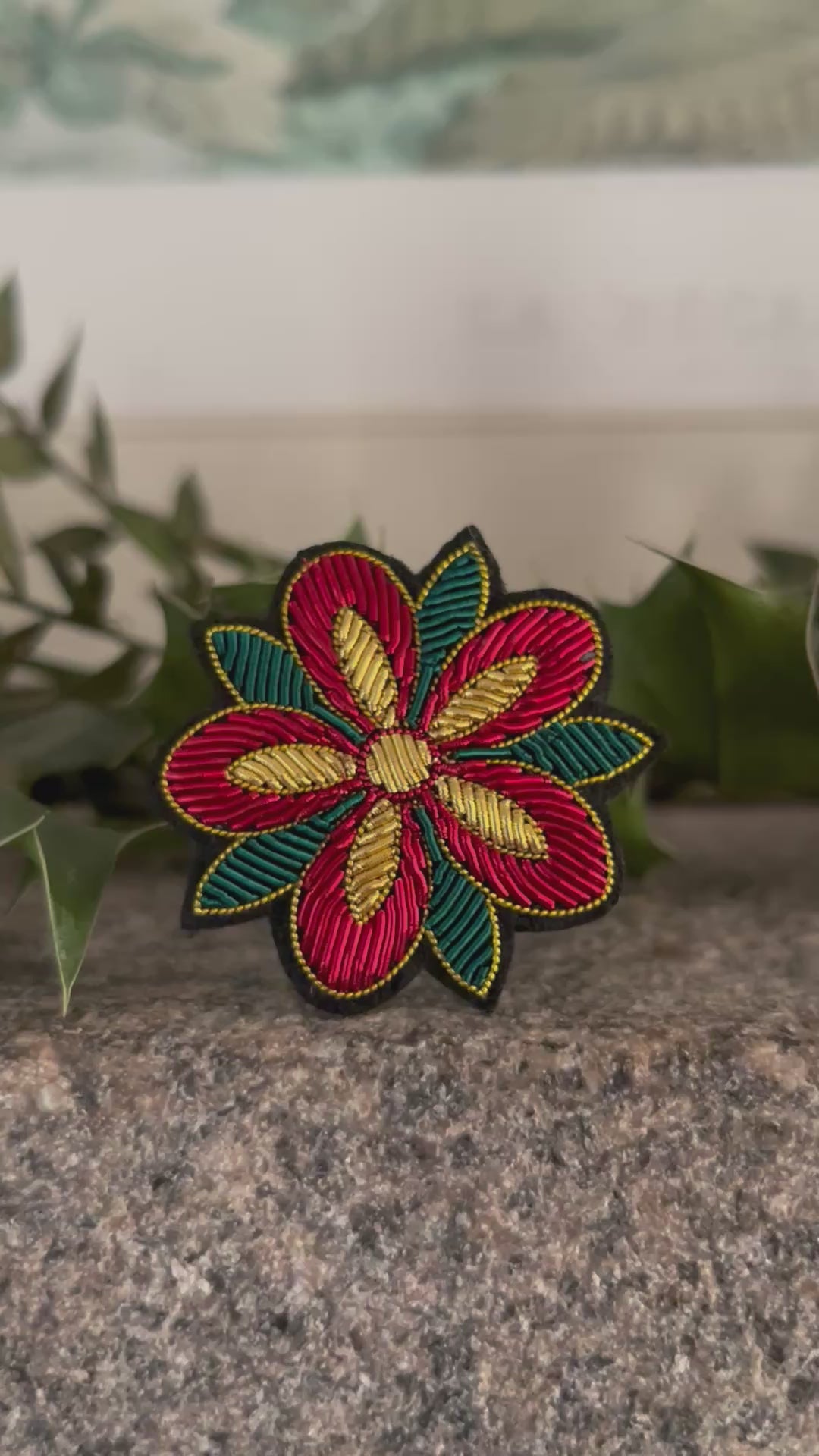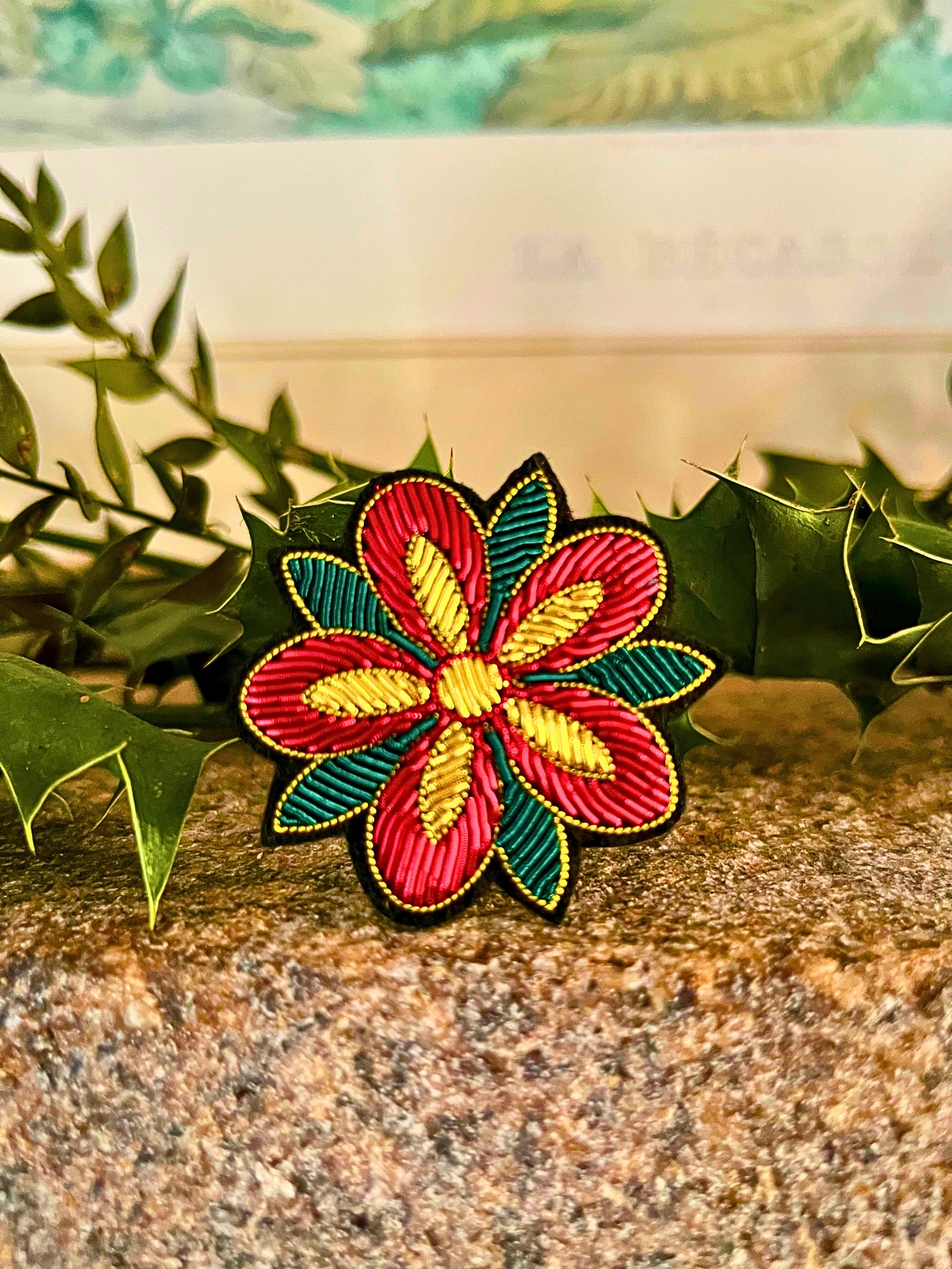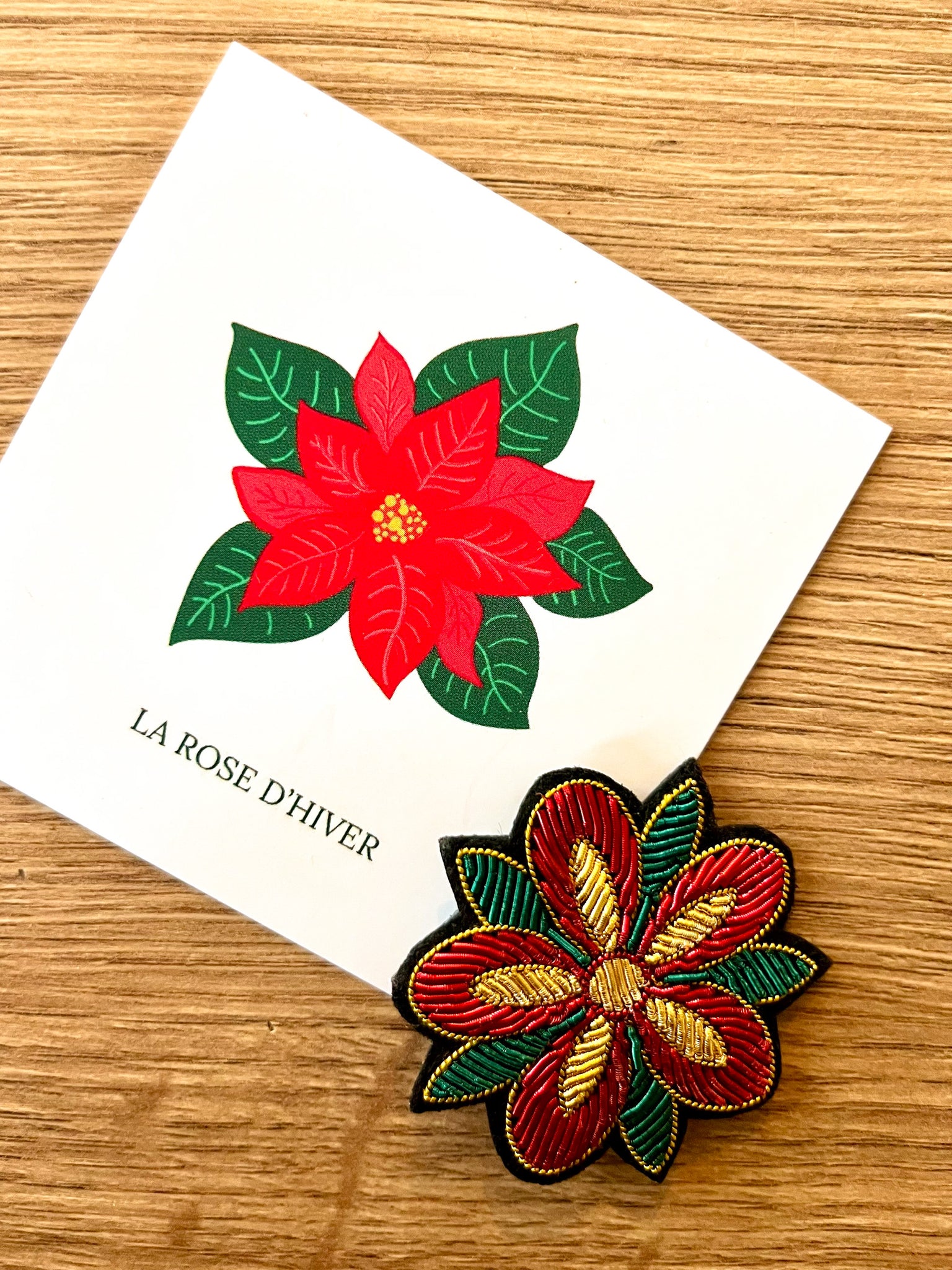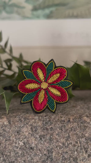Découvrez notre broche Rose d’hiver, entièrement brodée à la main selon la technique ancestrale de la cannetille. Inspirée du poinsettia, elle mêle des teintes chaleureuses de vert émeraude, rouge velours et doré.