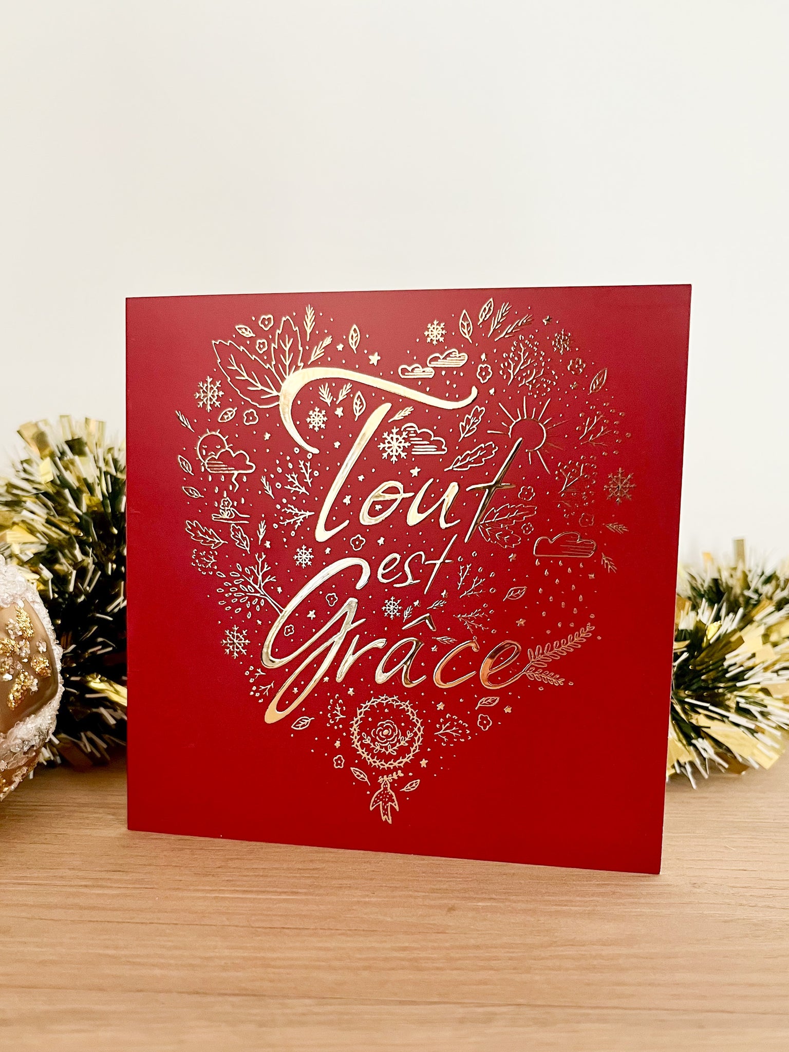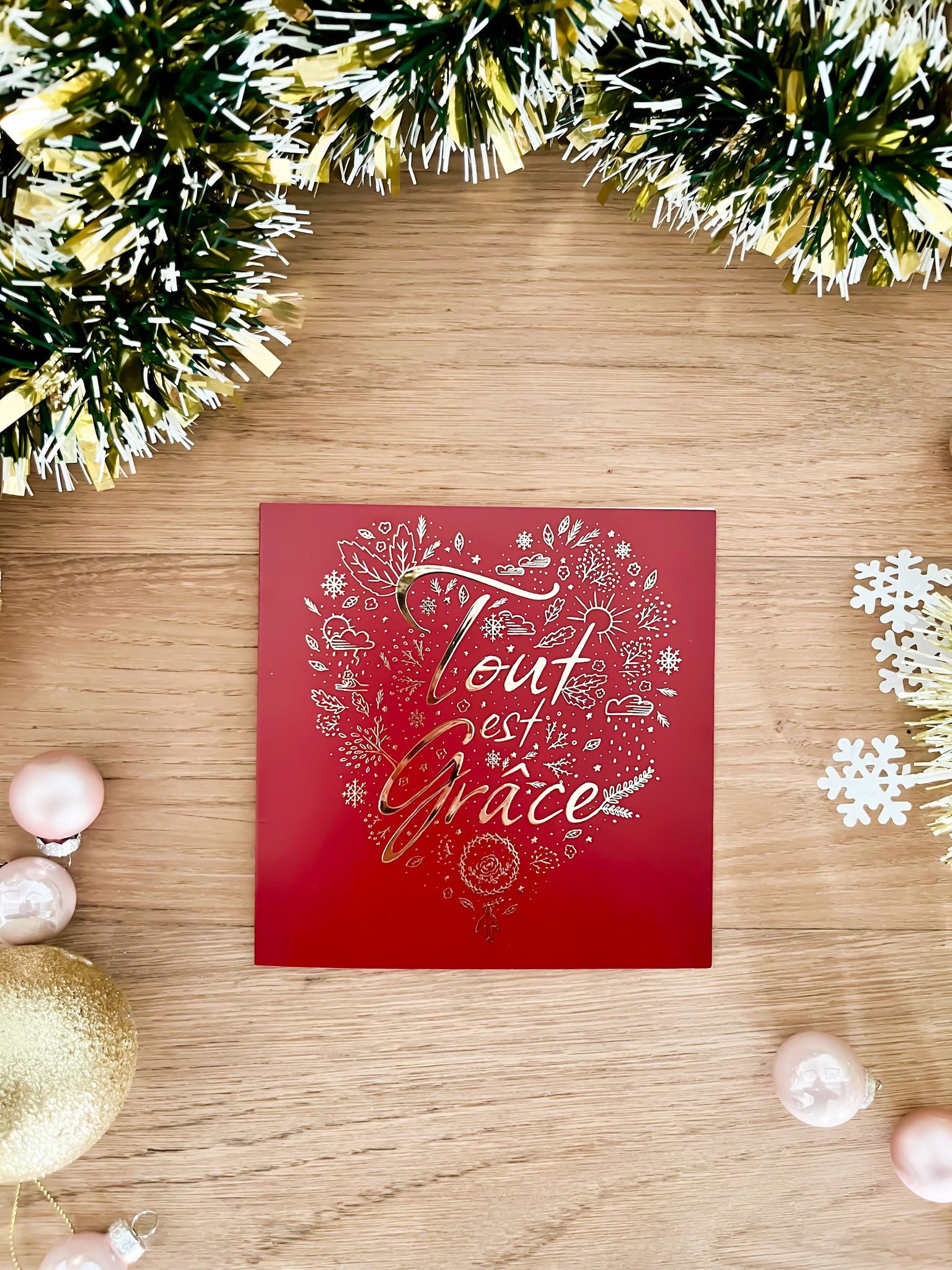 Le fond bordeaux, profond et chatoyant, évoque toute la douceur de Noel, tandis qu’un cœur délicatement doré met en valeur le message de Sainte Thérèse de l'Enfant-Jésus calligraphié : “Tout est grâce”.