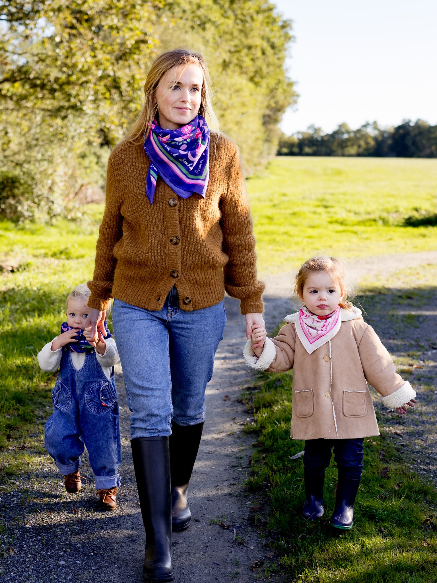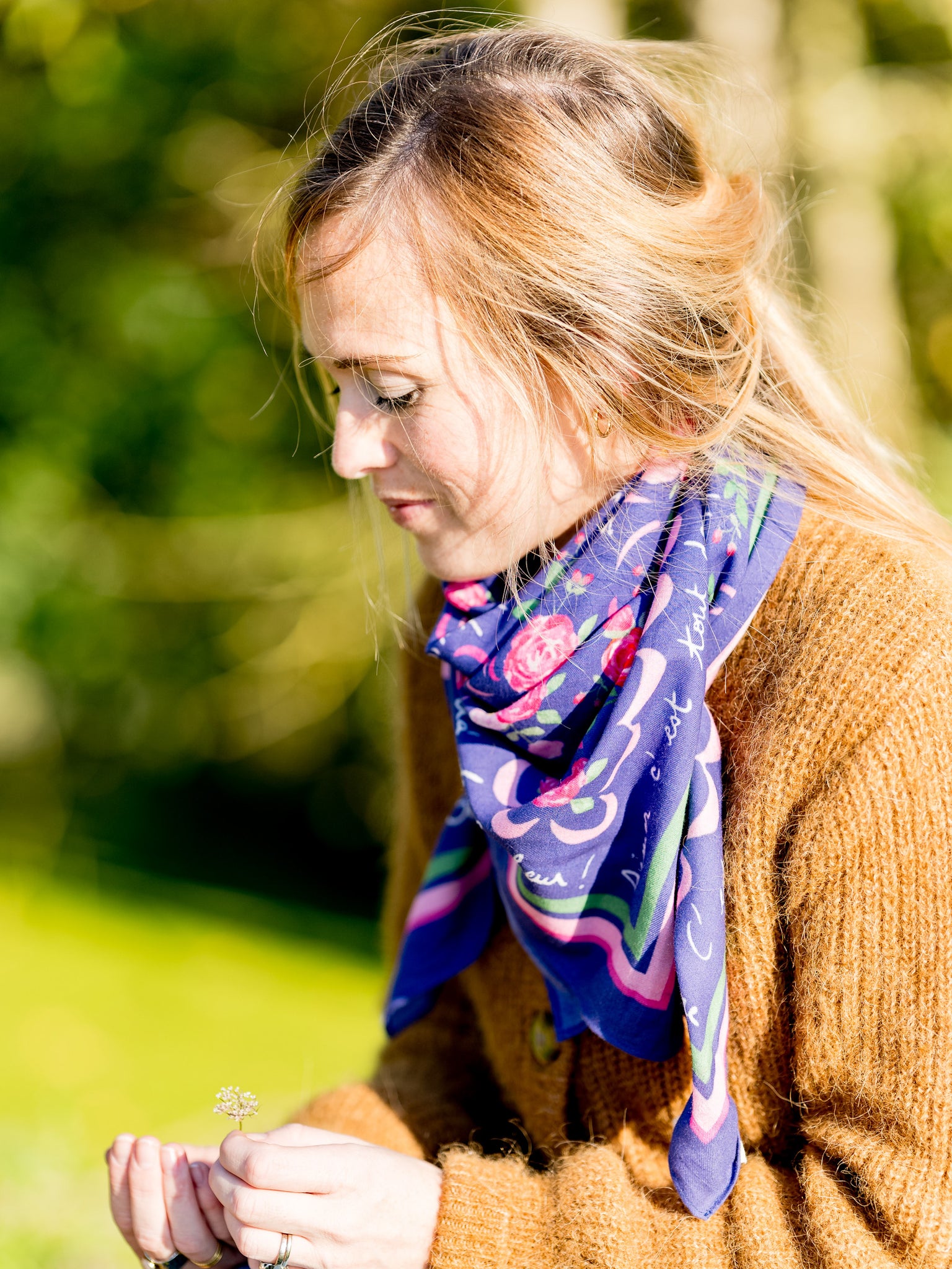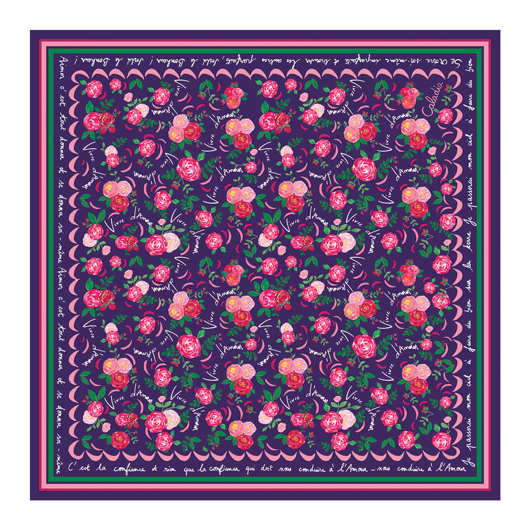 Découvrez notre grand foulard "Vivre d'Amour" violet, un accessoire unique qui allie modernité et spiritualité. Inspiré de notre célèbre croix de roses, peinte à la gouache, ce foulard est bien plus qu'un accessoire !
