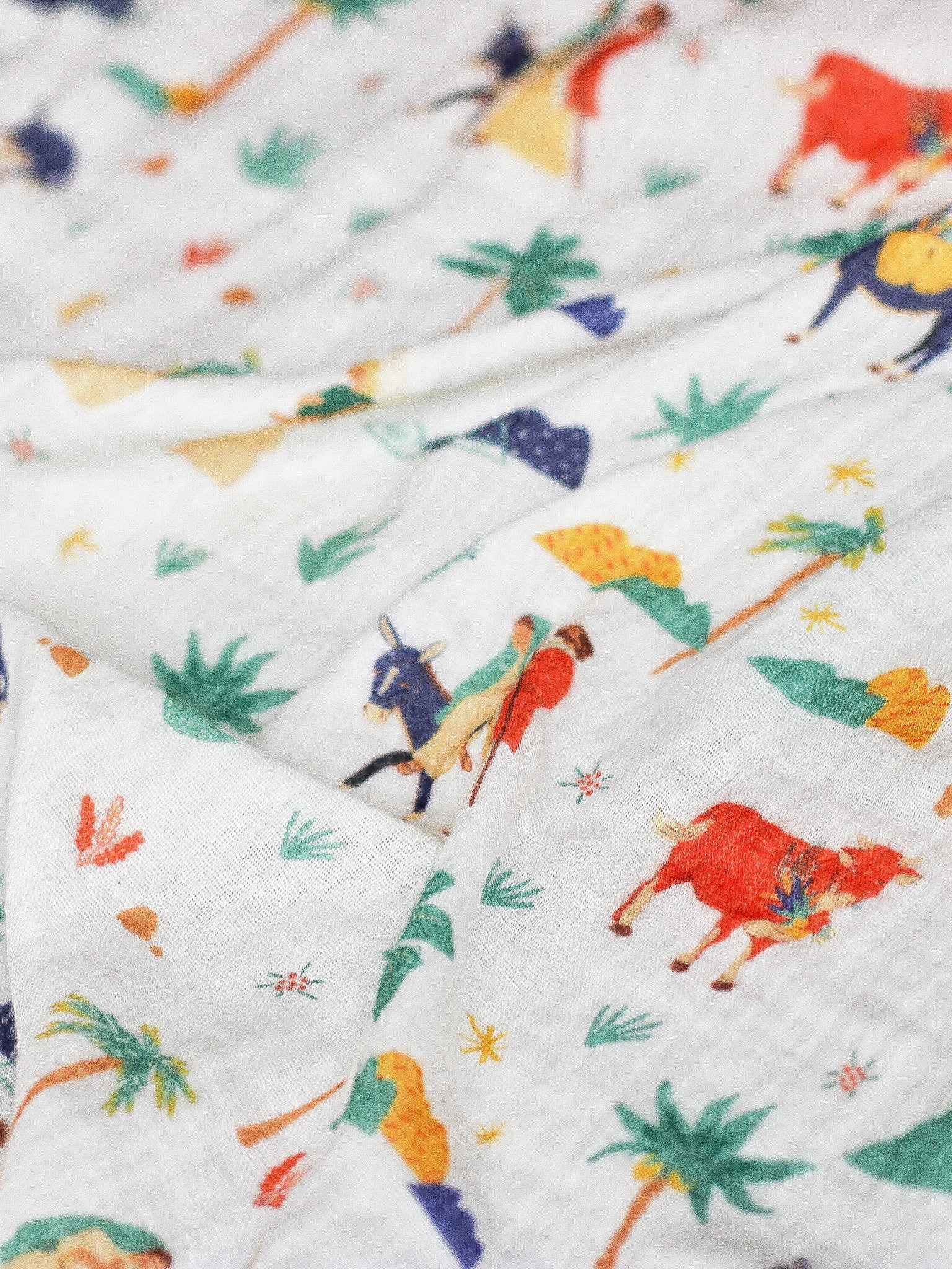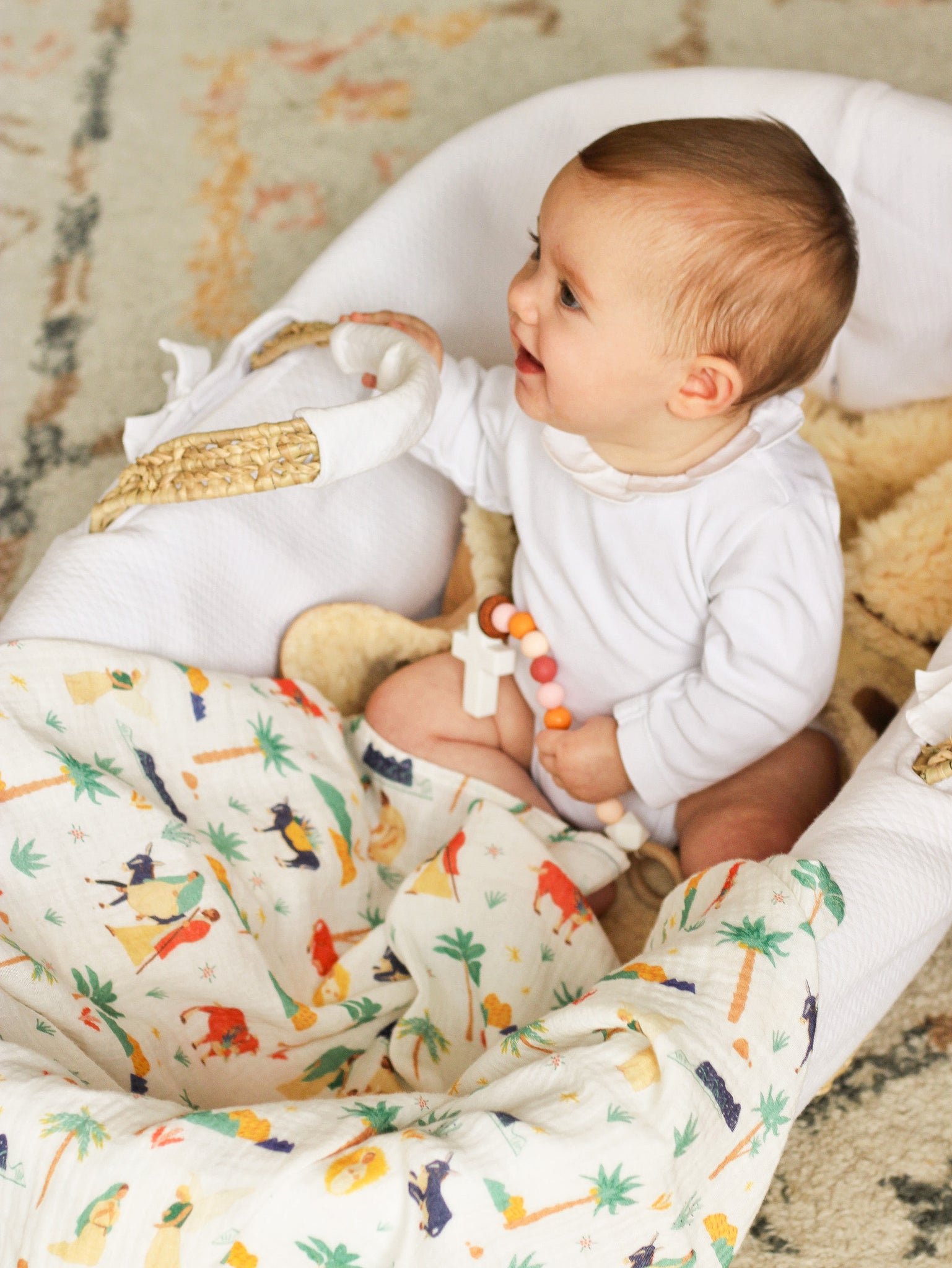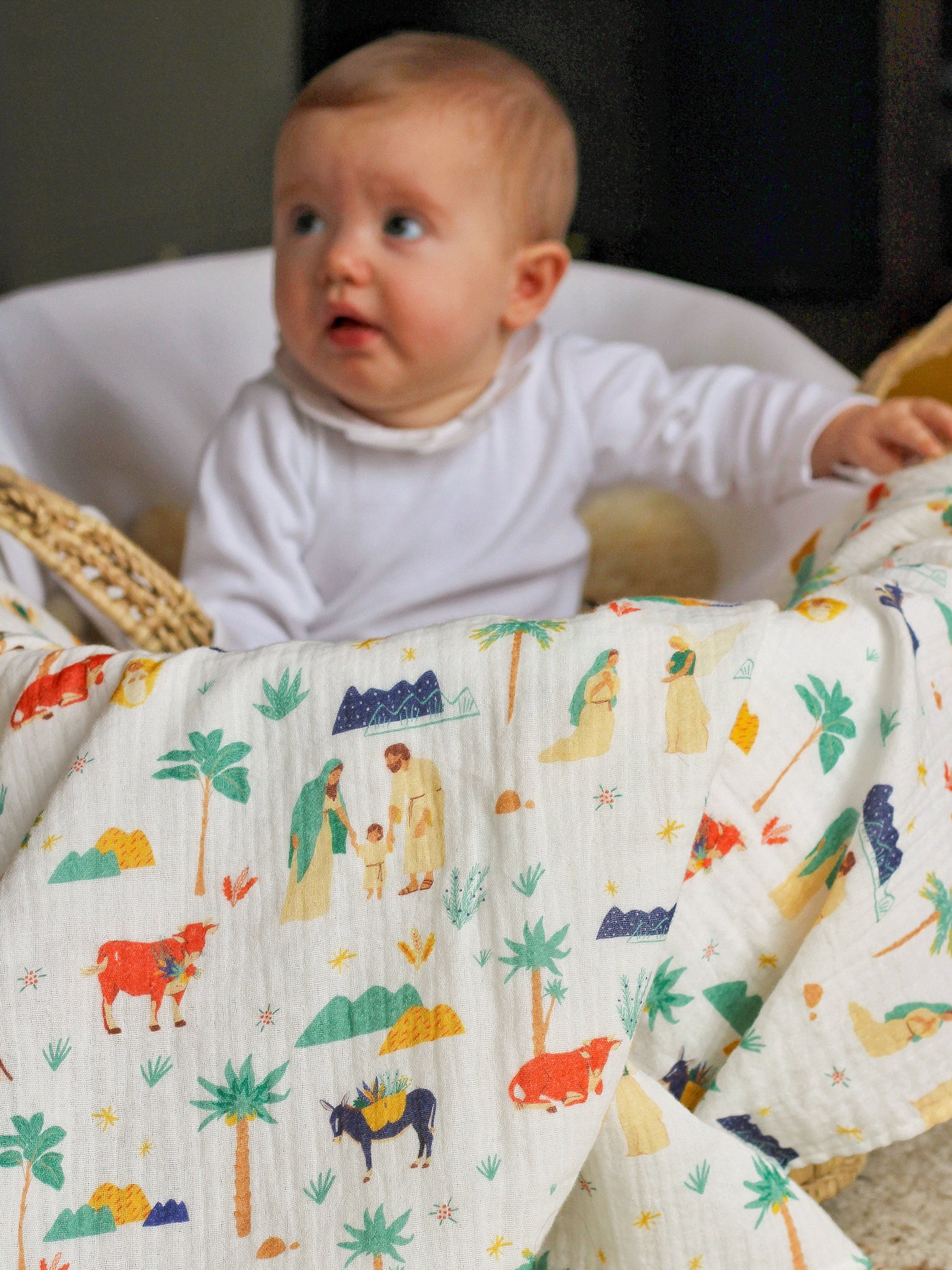 Coup de ♥️ pour ce motif Sainte Famille unique ! Ce motif doux et original représente différentes scènes de la vie de la Sainte Famille et de Jésus, de l'Annonciation, la Nativité jusqu'aux premiers pas du petit Jésus ! Le cadeau parfait pour les mamans et leurs bébés, à l'occasion d'un baptême, une naissance, Noël ou tout type d'événement joyeux ! Et l'accessoire indispensable pour bébé aux mille fonctions !