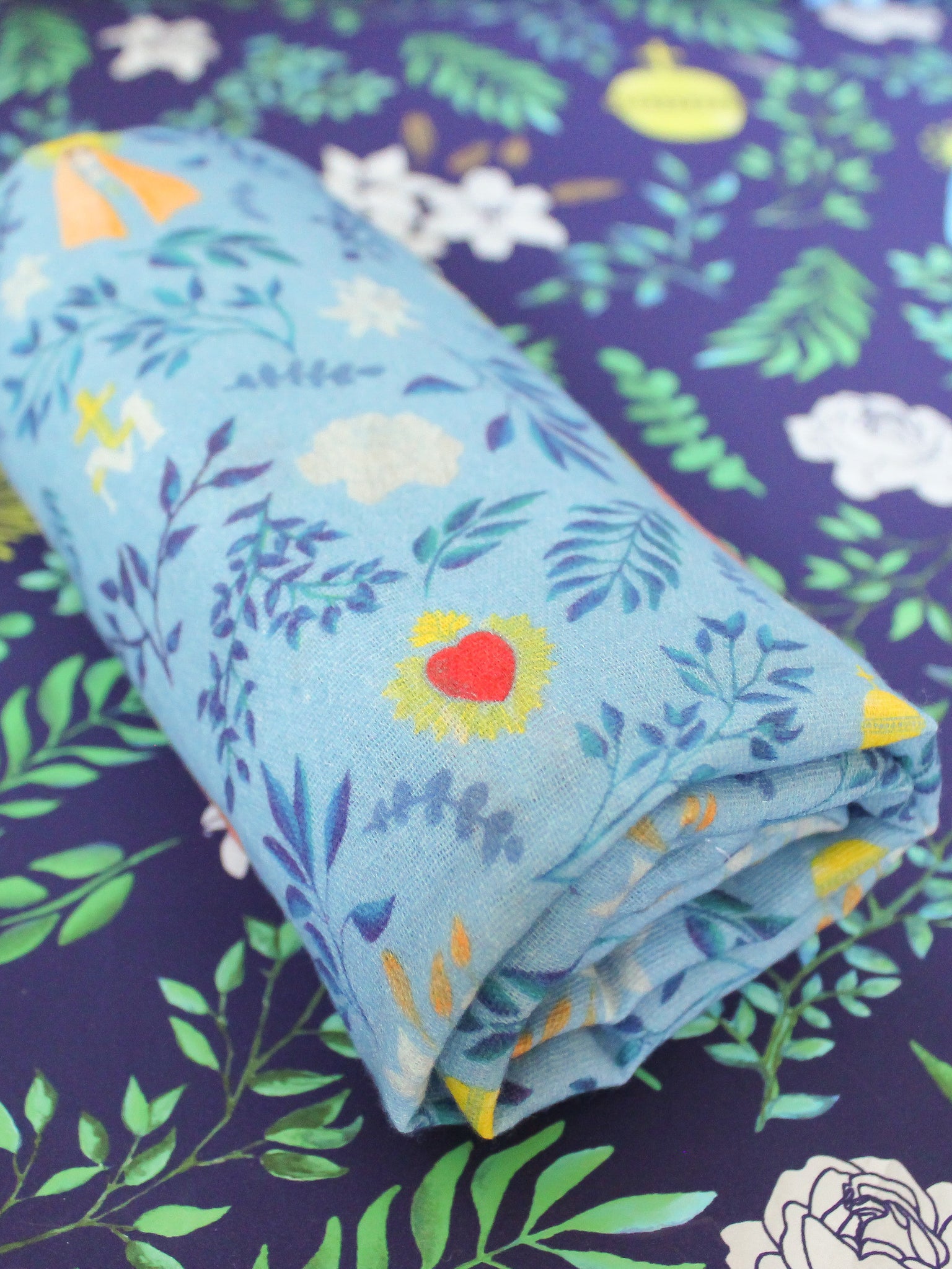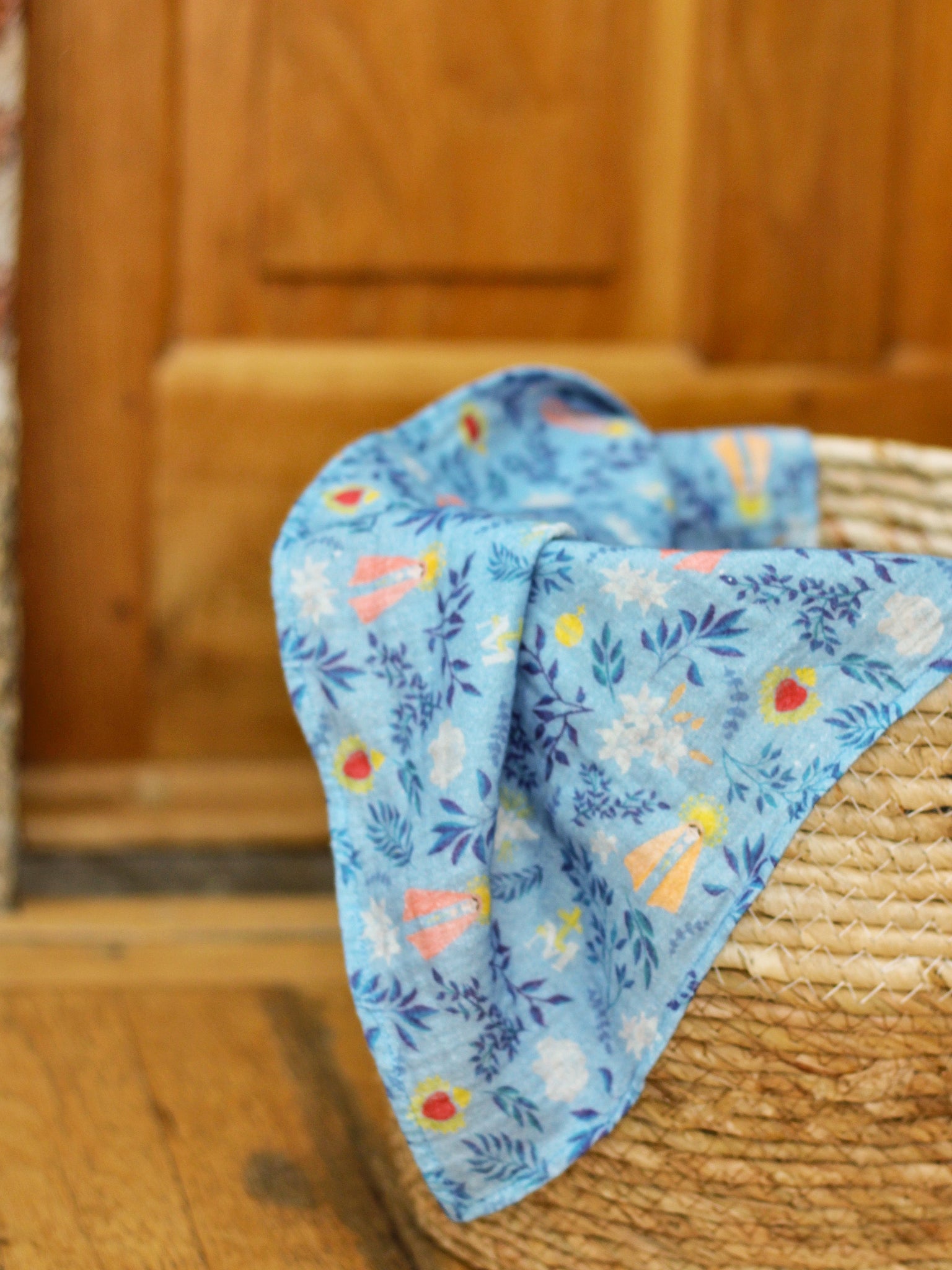 Un joli lange bleu ciel imprimé d'un magnifique motif marial unique reprenant les symboles de notre maman du ciel ! enveloppez vos bébés de l’amour et de la protection de Marie ! Tous nos motifs sont dessinés et développés à la main 😍