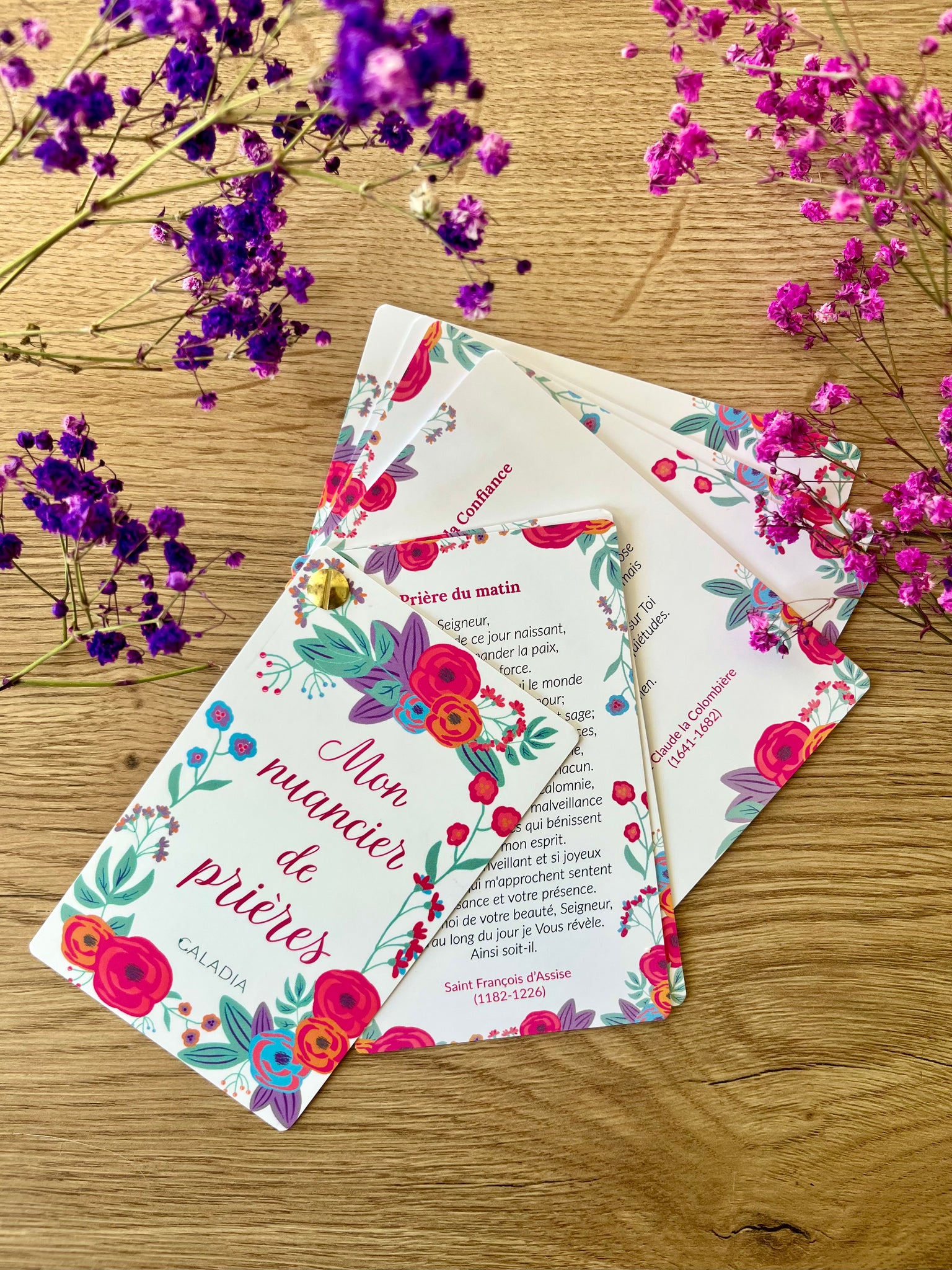 Au recto, vous trouverez une sélection soigneusement choisie de prières essentielles : prière à St Michel archange pour le combat, prière du matin de Saint François d'Assise, Magnificat, prière à l'Esprit Saint et d’autres trésors pour rythmer votre journée.