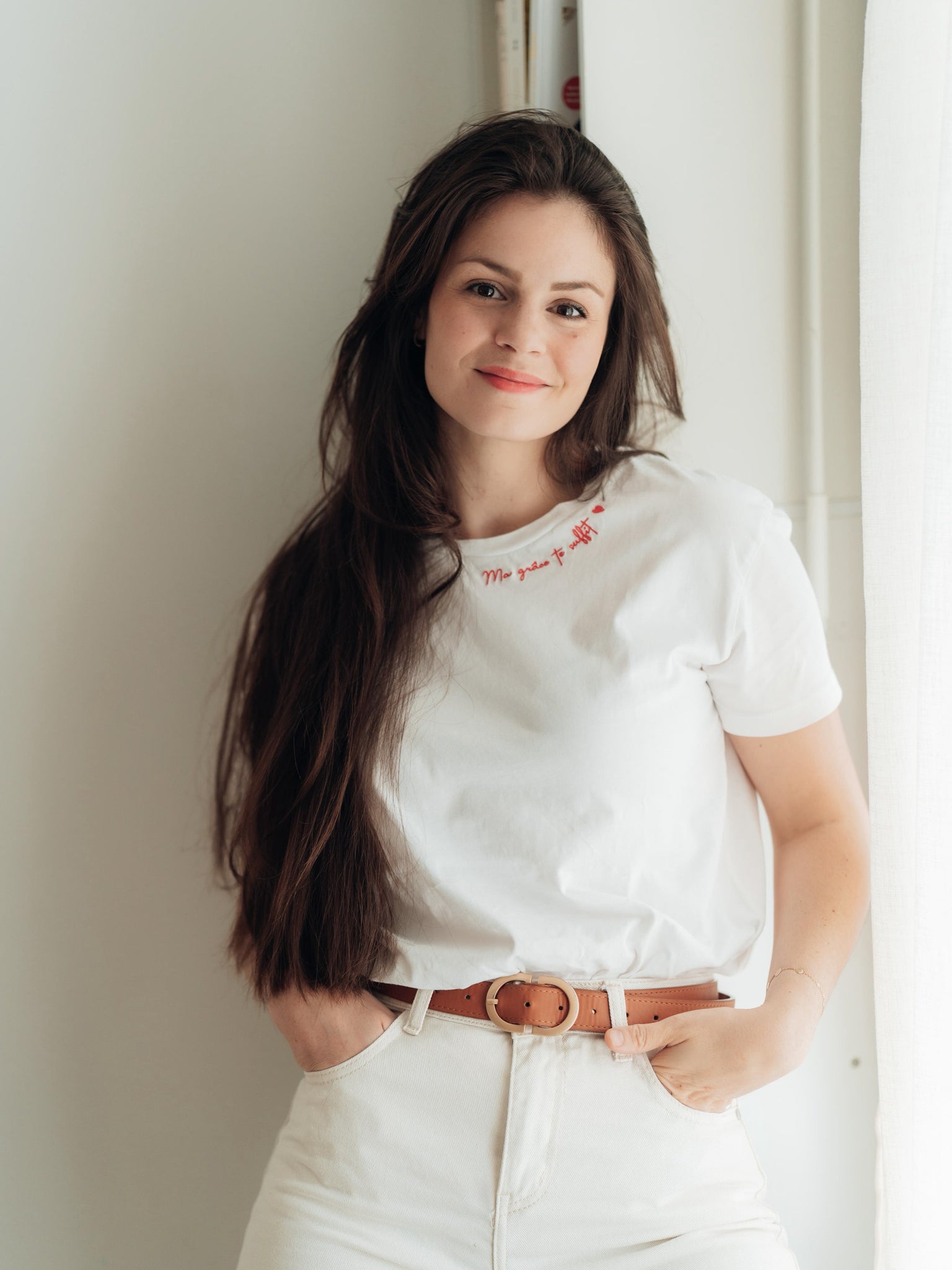 - Le verset "Ma grâce te suffit" brodé finement le long du col, en rouge coquelicot (ou rouge baisers) une couleur qui parle au cœur.