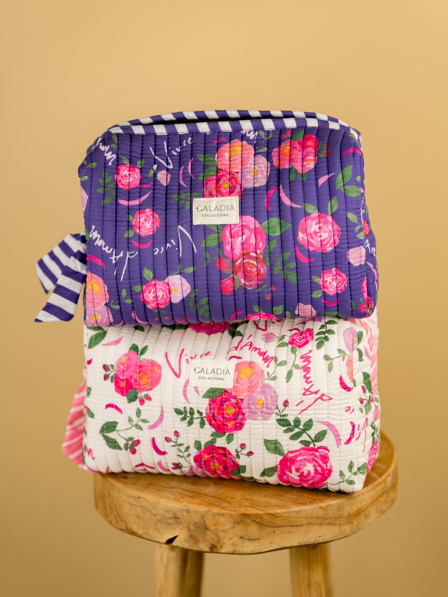Découvrez notre trousse de toilette Vivre d'amour violette, matelassée et doublée d’un enduit pratique pour éviter les fuites de maquillage. Disponible en imprimé « Vivre d’Amour » écru et violet, elle est parfaite pour la salle de bain ou les voyages. Avec son motif emblématique « Vivre d’Amour », cette trousse est un cadeau parfait pour soi ou pour quelqu’un qu’on aime.
